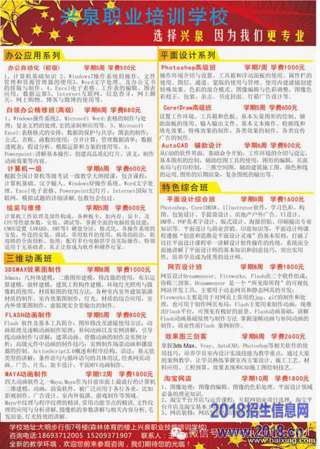 学校常年开设:办公自动化、高级文秘班、平面设计photoshop、CAD、3DMAX、计算机一级、二级、网页设计、新开设:MAYA三维动画、CG漫画设计、少儿美术班,我们欢迎有志的你加入我们,带你走进MAYA神奇的世界,兴泉教育将不断更新课程,吸纳优秀的人才,以高质量的培训回报每一位兴泉学子,新开课程,我们将以最优惠的价格,期待你的加入!