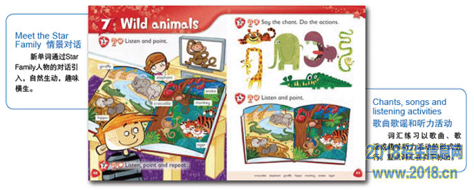 趣味时尚。课文围绕着Star一家人和他们的朋友展开主题,时尚可爱的人物形象贯穿整套教材,提升儿童学习积极性;律动歌曲歌谣和新颖多样的课堂活动使孩子们在课堂上保持兴趣,反复加深对语言的理解和应用。