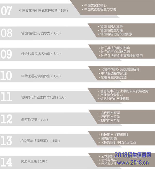 商业领袖工商管理高端课程研修班课程结合西方最前沿管理理念与 中国企业管理实践,突破仅限于“术”层面进行讲解所导致的同质性思维, 以前瞻的课程内容多层次、多维度地延展领导者的视野,激发深度思考, 帮助决策者在瞬息万变的商业环境中精准预见未来,突破固有思维模式, 提升把握机遇、整合资源以及规避风险的管理能力,同时打造个人领袖 气质,理解并欣赏商业和文化的融合与互动,在未来激烈的商业竞争环 境中先人一步,确立可持续的竞争优势,实现企业与社会、资源、环境 相协调的包容性发展。