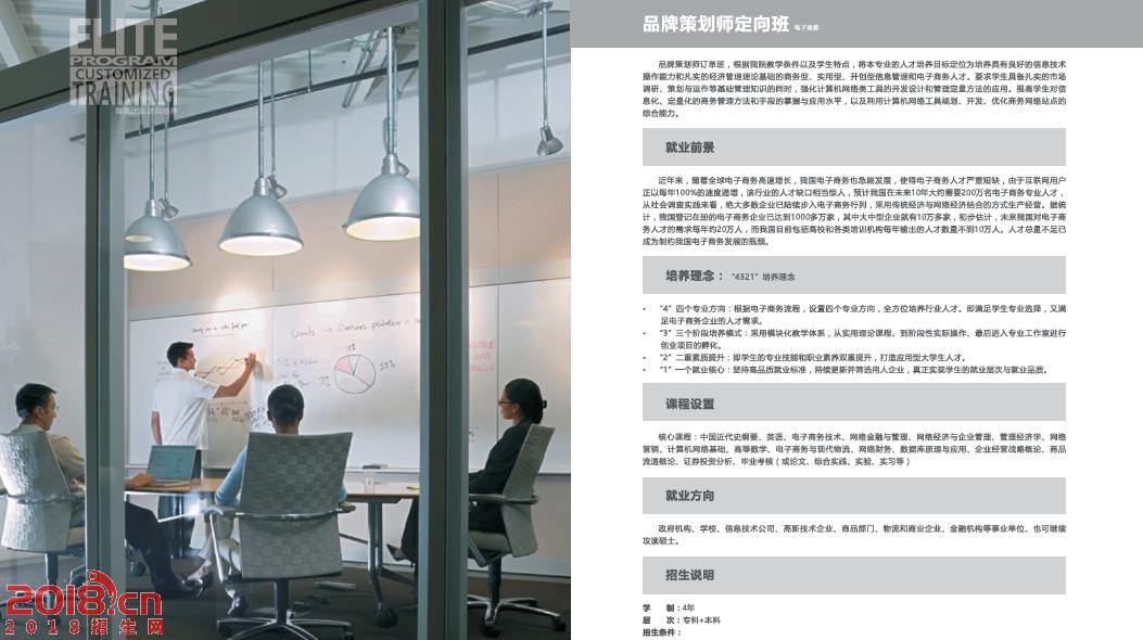 品牌策划师订单班立足于经济与管理学院,根据我院教学条件以及学生特点,将本专业的人才培养目标定位为培养具有良好的信息技术操作能力和扎实的经济管理理论基础的商务型、实用型、开创型信息管理和电子商务人才。要求学生具备扎实的市场调研、策划与运作等基础管理知识的同时,强化计算机网络类工具的开发设计和管理定量方法的应用。提高学生对信息化、定量化的商务管理方法和手段的掌握与应用水平,以及利用计算机网络工具规划、开发、优化商务网络站点的综合能力。