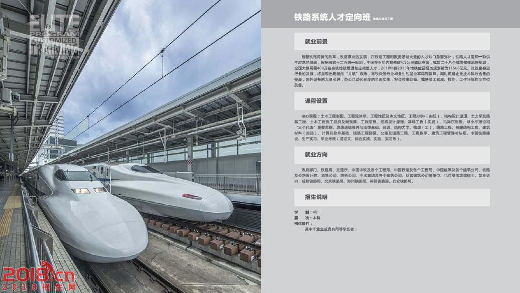 铁路客运人才订单班专业,该专业注重培养适应于现代动车、高铁发展需要,具有较高的业务能力和综合素质的铁路运输从业人员。通过职业技能的培训和综合素质的全面提高,使学生掌握从事铁路服务相关领域工作的基本知识和技能,从而成为能够为铁路运输服务发展做出贡献的复合型专业技术人才。