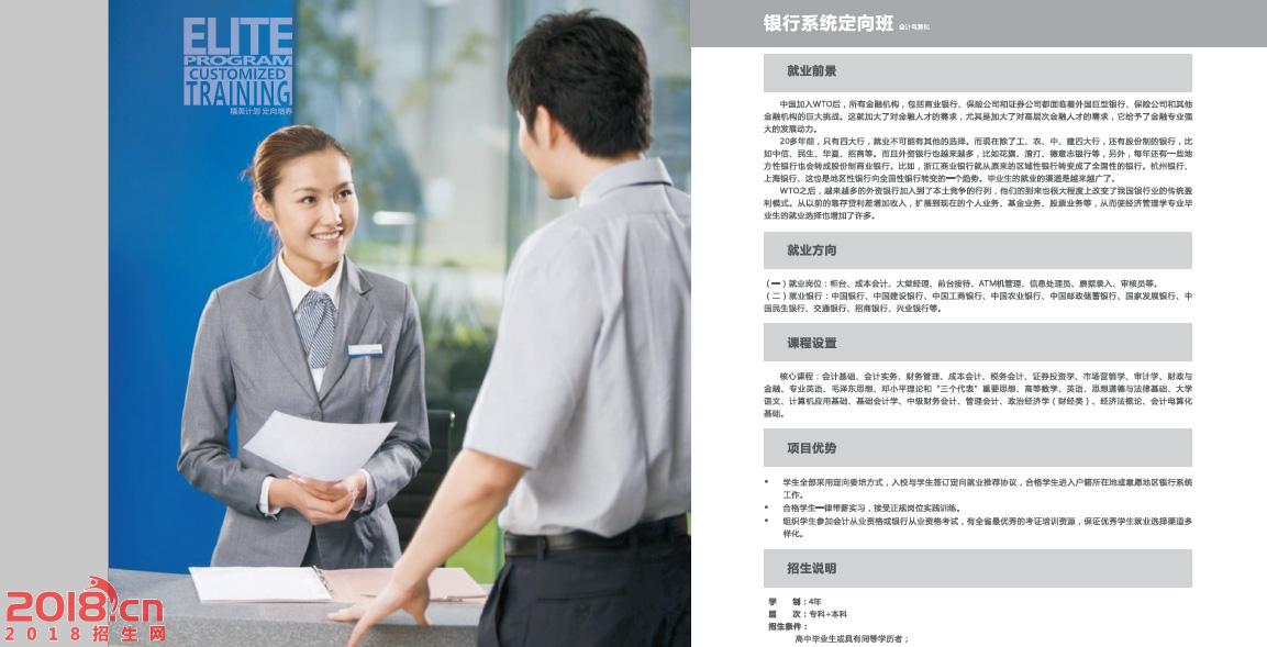 银行系统订单班专业,该专业注重会计理论和计算机技术的交融,使学生毕业后掌握满足市场经济发展需要的现代会计手段。专业设置秉承理论与实践并重,旨在培养以“管”为主,以理、工、经、文相佐,精通现代会计理论和方法,具有较强外语能力和计算机操作技能的现代化工商企业的高级管理人才。