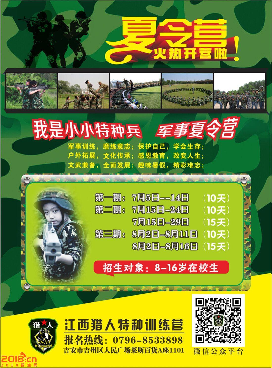 您的孩子有足够强的竞争和沟通意识吗?您的孩子有超强的执行力吗?您的孩子有怎样的抗压和耐挫的能力呢?您的孩子已经具备基础的自理能力吗?您的孩子能够理解父母师长的一番苦心吗?从现在开始,给您的孩子一次独立生活的天空;行为的改变不是靠乏味的说教,而是心灵的触动!猎人教育就是以体验式的教学模式,让您见证身心的改变!本次夏令营采取全真军事夏令营活动,内容有单兵队列训练,军事基础知识,军事小擒拿手,军体拳,野营拉练,野外生存,定向越野,拉歌、夜间放哨、勇敢孩子拓展训练,自己动手制作航模等生动有趣的活动.参营时间为15天.通过准军事化管理,组织参营孩子按照军队编制以班、排、连、营开展军事夏令营活动,“零距离”感受军旅生活,全真模拟“我是一个兵”,并有感恩教育等特色内容。在本次夏令营活动中将融入感恩教育,在军营活动中提出,引导孩子思考感恩父母、感恩社会;另外还会安排一些特别活动,让孩子体验到感恩。同时,夏令营中孩子每天会写日记,让孩子记录在夏令营生活的点点滴滴,结束活动时,会从每个孩子日记中挑选出一篇最优秀的,编订成书出版,赠送给孩子留念。另外,一些活动还包括参观爱国主义教育基地,实战对抗等活动。