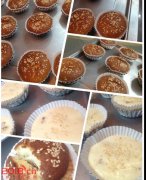 6、福建学烘焙的小黄告诉大家将纸放入连膜模具,倒入蛋糊8分满,撒上少许坚果碎,我放了葵花籽仁。